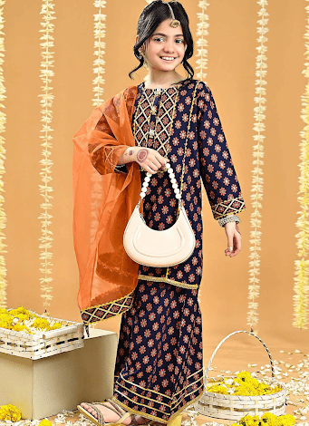 Palazzo and culottes are becoming increasingly popular. These designs combine modern trends with traditional charm, making them versatile for semi-formal gatherings. Lightweight fabrics and wide-leg cuts ensure comfort while adding a chic touch. Pairing palazzo pants with festive tops or short kurtis creates a balanced and fashionable outfit for girls of all ages.