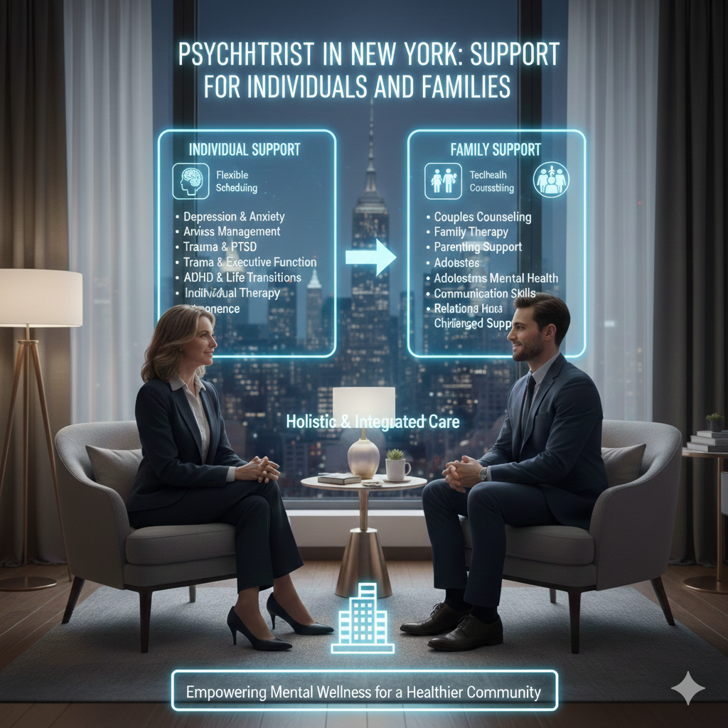 A psychiatrist in New York understands the impact of urban living on mental health. Treatment plans often include stress management strategies, sleep support, and structured coping techniques designed to improve resilience.